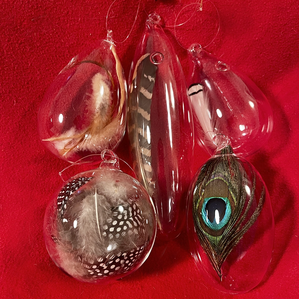 Touched with glittery-gold, celestial floating feathers sparkle atmosphere within our variegated mouth-blown glass christmas ball ornaments. Float them in the corner of a living room or scatter them in a boho-chic way on the table or mantel or simply hang them in multiples on trees. Sold in sets. Each set contains 1 each of various shapes/sizes.